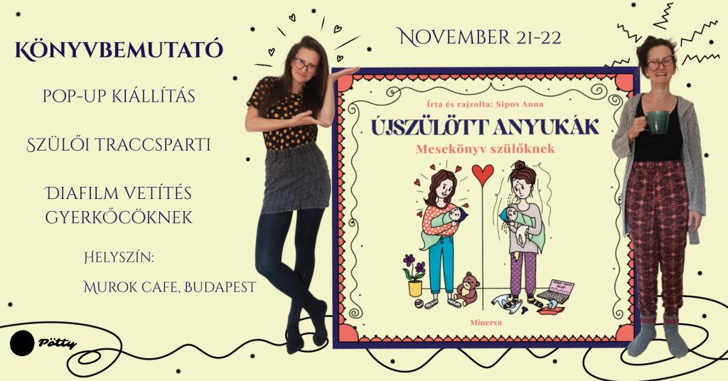 Pénteken lesz megnyitó és könyvbemutató, és ebben a 3 napban a kávézóban kiállítjuk az elmúlt évek anyasággal kapcsolatos Pötty-rajzait. Szombaton lesz traccsparti a szülőknek, ezzel egy időben pedig diafilmvetítés a gyerekeknek. Péntek-szombaton végig ott leszek a kávézóban, hogy tudjunk személyesen találkozni és csacsogni egyet a könyvről, a babákról, és hogy milyen is az újszülött anyaság.
